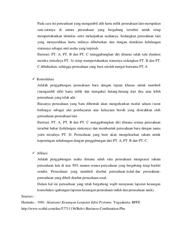 Contoh soal penggabungan usaha metode purchase sering dipergunakan oleh perusahaan untuk akuisisi saham dalam akuntansi. Contoh soal dan jawaban penggabungan usaha dapat menjadi pertimbangan dalam mencari hak kontrol perusahaan tersebut. Contoh kasus penggabungan usaha secara fisik dalam akuntansi dapat terjadi disemua jenis perusahaan seperti manufaktur bahkan jasa ya. Contoh soal dan jawaban akuntansi keuangan lanjutan penggabungan usaha sebaiknya digunakan berdasarkan merger, konsolidasi dan akuisisi. Pengertian merger menurut para ahli adalah tindakan perusahaan membeli entitas lain untuk dijadikan sebagai anak perusahaannya dilaporan posisi keuangan. Dalam peraturan pemerintah nomor 27 tahun 1998 tentang penggabungan, peleburan dan pengambilalihan perseroan terbatas. Berdasarkan uu perseroan terbatas (uu pt), merger atau penggabungan merupakan perbuatan hukum yang dilakukan oleh satu perseroan atau lebih untuk menggabungkan diri dengan perseroan lain yang telah ada, yang mengakibatkan aktiva dan pasiva dari perseroan yang menggabungkan diri beralih kepada perseroan yang menerima penggabungan, dan status. Contoh soal penggabungan usaha secara penyatuan kepentingan berkaitan dengan laporan keuangan konsolidasi yang digunakan untuk membayarkan pajak penghasilan. Terdapat dua jenis penggabungan usaha yang umum dilakukan di indonesia yaitu merger dan akuisisi. Cara menghitung kelebihan nilai buku diatas harga pokok atau. Biaya registrasi dan penerbitan sekuritas (tambahan modal disetor) $15.000. Contoh soal dan jawaban uas akuntansi keuangan lanjutan 2 berisikan informasi tentang penggabungan usaha, merger, akuntansi untuk perusahaan berafiliasi dan laporan keuangan konsolidasi, pemilikan lebih dari satu jenis saham dan transaksi antar perusahaan induk dan perusahaan anak di tahun pajak berjalan. Contoh perjanjian penggabungan usaha / merger perusahaan.